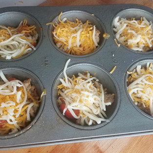 Divide ground sausage mixture between the 6 muffin tins. Top with 1 Tbsp of cheese. Pour in egg mixture to top off the muffins.